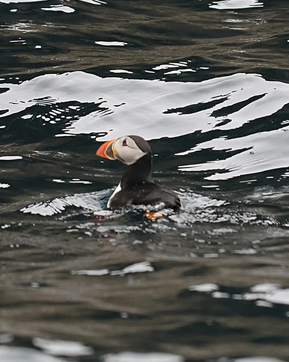 Your journey begins at the small-boat marina in Sørvágur, where you’ll meet your experienced local skipper. After a short safety briefing and life-jacket fitting, the boat glides smoothly out of the harbour toward open sea. Along the way, you’ll enjoy views of Akranes, Múlafossur Waterfall, and the rugged coastline of Vágar Island.